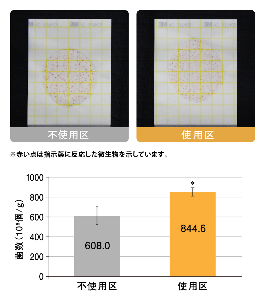 ※1「ペトリフィルム(TM)培地(生菌数測定用)」を使用 - 測定項目:菌数(指示薬に反応した赤い点を目視で計測)
