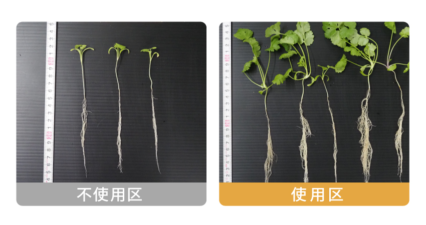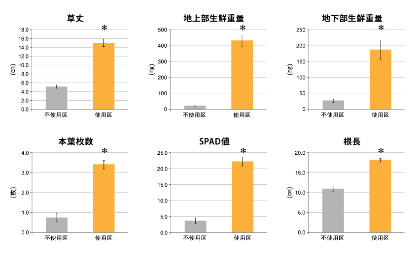 ※草丈、地上部生鮮重量、地下部生鮮重量、本葉枚数、SPAD値、根長が増加